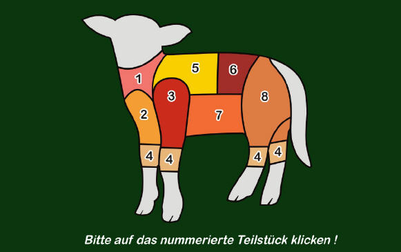 • der vorderer Teil des Rückens mit Rippenenden besteht aus Stielkoteletts • der hinterer Teil des Rückens besteht aus Lendenkoteletts • sehr saftig und zart • zum Kurzbraten und Grillen